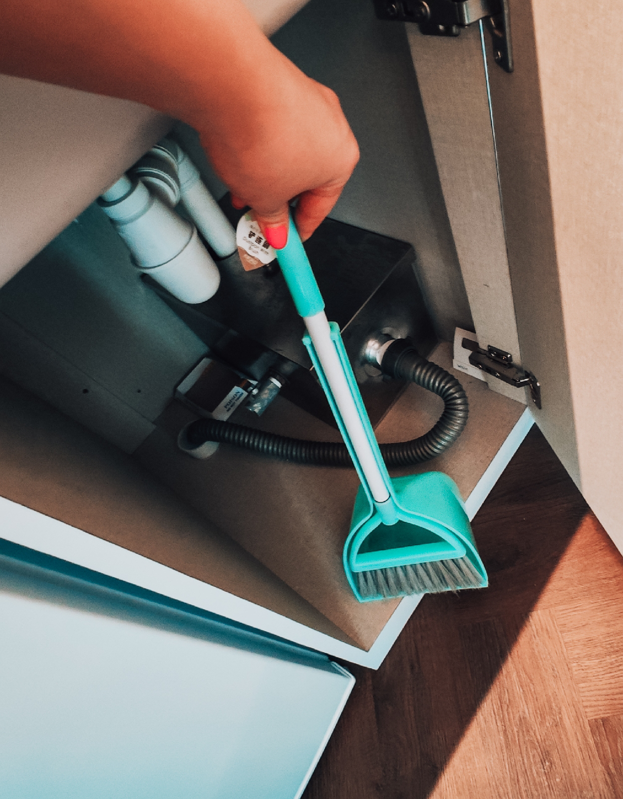 There is a little tiny broom set in case you or your kids bring sand in and step all over the house.